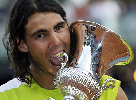 Spain's Rafael Nadal poses with the trophy after winning the final match against Roger Federer of Switzerland at the Rome Masters tennis tournament in Rome May 14, 2006.[Reuters]