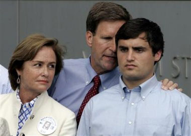 David Evans, right, senior captain of the Duke lacrosse team stands in front of the Durham County Detention Center with his parents Rae, left, and father David, before turning himself in Monday, May 15, 2006, in Durham, N.C. Evans was the third player indicted for the sexual assault of an exotic dancer.[AP]