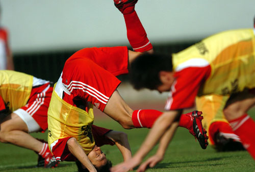 China's national soccer team players prepares for a warm-up game with Switzerland and Frence in June at their first training session in Jinan, capital of China's Shandong Province, May 15,2006.[Xinhua]