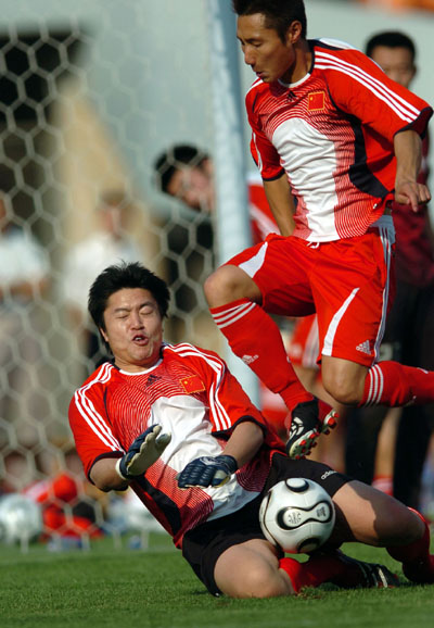 China's national soccer team players prepares for a warm-up game with Switzerland and Frence in June at their first training session in Jinan, capital of China's Shandong Province, May 15,2006.[Xinhua]