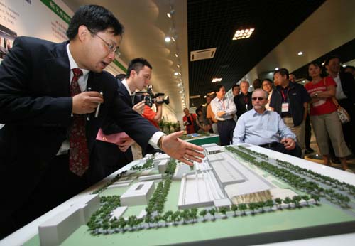 Director of 2008 Project Construction Jin Yan (L) shows a model of a future