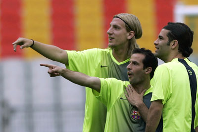 Barcelona preparing for the Final against Arsenal (Reuters) Updated: 2006-05-17 10:28  Barcelona's (L-R) Maxi Lopez, Ludovic Giuly of France and