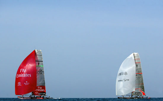 America's Cup challenger Emirates Team New Zealand (L) and defender Alinghi of Switzerland race downwind with spinnakers on the eleventh flight of their match race during the sixth day of the Valencia Louis Vuitton Act 10 in Valencia, eastern Spain May 16, 2006. The races in Act 10 will count towards a bonus point system leading up to the 32nd America's Cup in 2007.[Reuters]