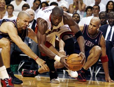 Miami Heat guard Dwyane Wade (C) fights for the ball against Nets guard Jason Kidd (L) and forward Richard Jefferson (R) during his team's win against the New Jersey Nets during Game 5 of their NBA Eastern Conference semifinals playoff series in Miami, Florida May 16, 2006. The Heat defeated the Nets 106-105 and won the series 4-1 to advance to the Eastern Conference finals. [Reuters]