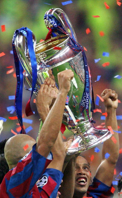 Barcelona's Ronaldinho of Brazil (R) celebrates winning the Champions League