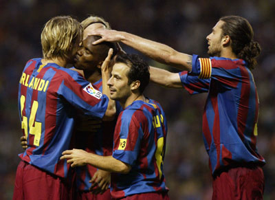 Barcelona's Samuel Eto'o Fils (2nd L) of Cameroon, Andrea