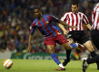 Barcelona loses 3-1 to Athletic Bilbao (Reuters) Updated: 2006-05-21 13:58  Barcelona's Samuel Eto'o Fils of Cameroon controls the ball