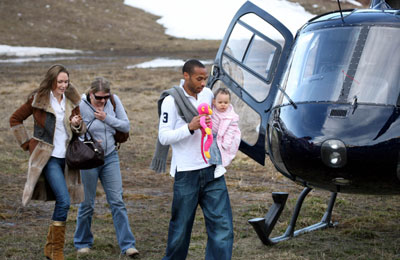 French soccer star Thierry Henry of Arsenal holds his daughter Tea as he arrives by helicopter at Tignes ski resort in French Alps, May 21, 2006. All 23 players of the national team arrived today in Tignes for a 4-day training session in preparation for the upcoming World Cup in Germany.[Reuters]