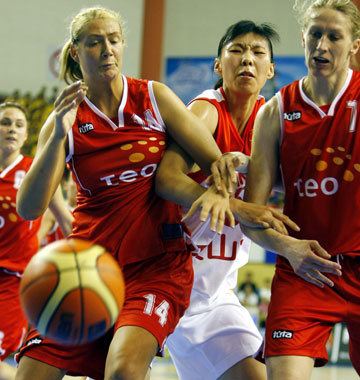 Chinese player Chen Nan (C) challenges for the ball against two Lithuanian players.[Xinhua]