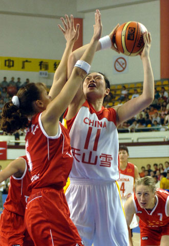 Chinese player Chen Xiaoli (No. 11) lays-up against the block from the opponent.[Xinhua]