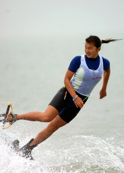 A woman surfer compete during the third national surfing competion in Suzhou, east China's Jiangsu province May 22, 2006. [Xinhua]