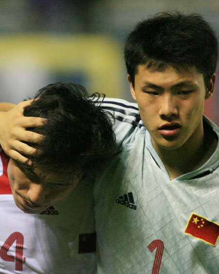 China's goalkeeper Wang Dalei, right, consoles his teammate after their