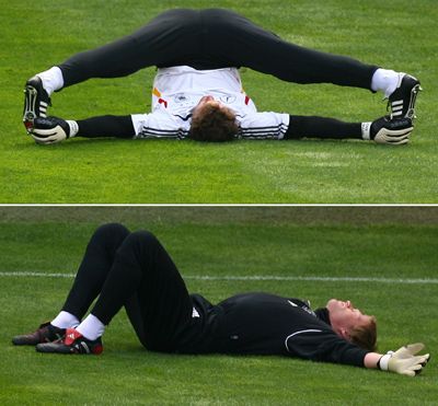 Germany's national soccer team number one goalkeeper Jens Lehmann (top) and his