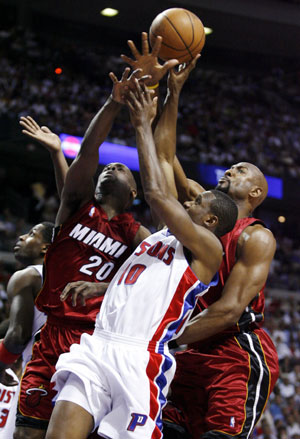 Miami Heat's Alonzo Mourning (R) and Gary Payton (L) combine to block a shot by Detroit Pistons guard Lindsey Hunter in the fourth quarter of the Heat's 91-86 win over the Pistons in Game 1 of the NBA Eastern Conference Finals in Auburn Hills, Michigan May 23, 2006. [Reuters]