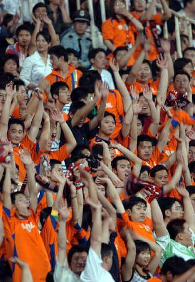 Shandong Luneng's Fans cheer after the team defeated Changchun Yatai in 2-0 in China Super League held in Jinan,capital of China's Shandong Province, May 24, 2006.[Xinhua]
