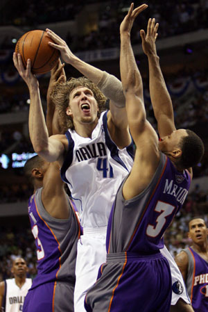 Suns beat Mavs 121-118 (Reuters) Updated: 2006-05-25 14:17  Dallas Mavericks forward Dirk Nowitzki (C) struggles to get a
