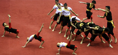 Players perform after the Sports Acrobatics contest in the 3rd All-China Games in Changshu, East China's Jiangsu Province, May 25, 2006. [Wang Lili/Xinhua]