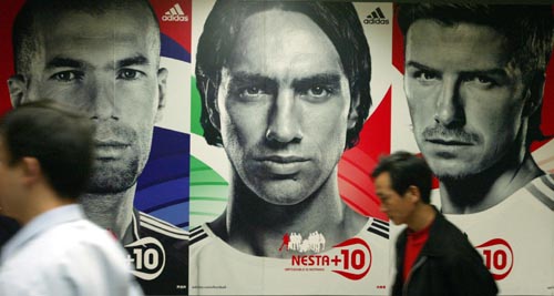 A couple of famous soccer stars' portraits were hung up at Xidan Station of Beijing Metro May 22, 2006 [newsphoto]