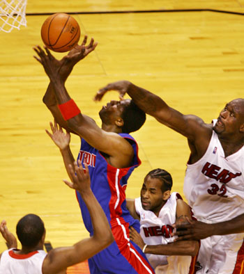Miami Heat defeat Pistons to lead 2-1 (Reuters) Updated: 2006-05-28 12:44  Miami Heat center Shaquille O'Neal (32) tries to block a throw by