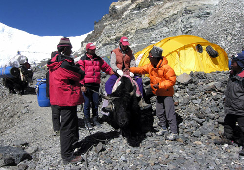 Australian mountaineer Lincoln Hall, on the back of a yak and with his hands bandaged, prepares to depart from Advanced Base Camp at 6400m (20,800ft) on Mount Everest, for a lower camp May 28, 2006. Hall, who was thought to have died near the summit of Mt Everest was found alive after spending a night out on the world's highest mountain, but remains severely ill with frostbite and altitude sickness.[Reuters]