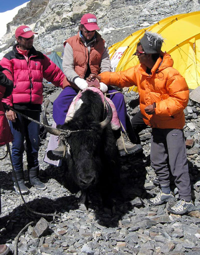 Australian mountaineer Lincoln Hall, on the back of a yak and with his hands