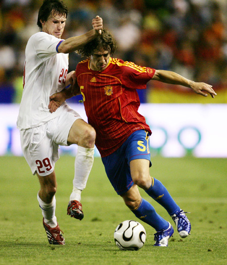 Spain's Carles Puyol (R) fights for the ball with Russia's Titov during their