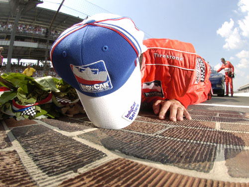 Sam Hornish Jr. lies face-down on the yard of bricks at the start-finish line