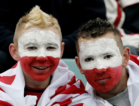 Polish soccer fans smile during a friendly soccer match between Poland and Colombia in Chorzow May 30, 2006.  [Reuters]