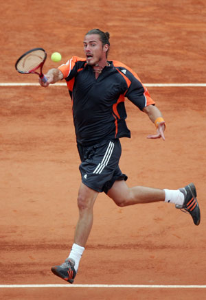 Russia's Marat Safin plays a shot to Fernando Gonzalez of Chile during the French Open tennis tournament at Roland Garros in Paris May 30, 2006.[Reuters]