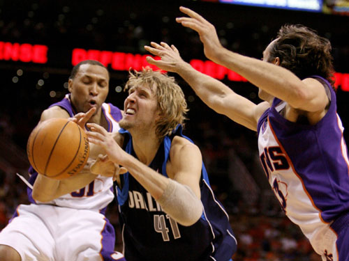 Dallas Mavericks Dirk Nowitzki (C) loses control of the ball against the defense of Phoenix Suns Steve Nash (R) and Shawn Marion during Game 4 of their NBA Western Conference finals in Phoenix, Arizona, May 30, 2006. The Suns won 106-86. [Reuters]