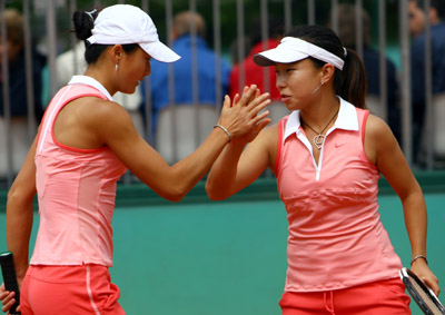 Yan Zi (L) and Zheng Jie of China celebrate after ousting their rivals during their opener at the French Open, Roland Garros, Paris May 31, 2006. [Xinhua]