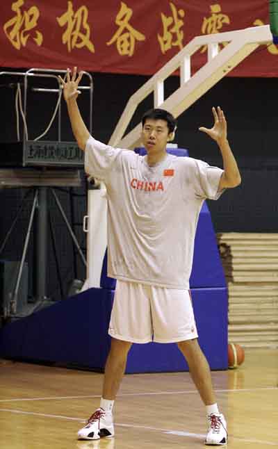 China's first NBA player Wang Zhizhi practises with the national basketball team in Beijing June 2, 2006. Wang has earned a recall to the national team after four years in the wilderness following his refusal to play in the 2002 Asian Games. An apologetic Wang returned to his homeland admitting that he had made a mistake and asked to be reconsidered for national duty. Wang paved the way for Chinese NBA players Yao Ming and Menk Barteer when he signed for the Dallas Mavericks in 2001. [Reuters]