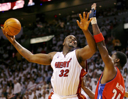 Heat beat Pistons, advance to NBA finals (Reuters) Updated: 2006-06-03 11:02  Miami Heat center Shaquille O'Neal (L) goes high to shoot under