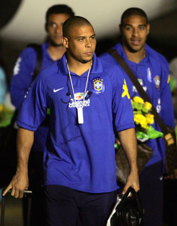 Brazilian soccer forwards Ronaldo (C) and Adriano (R) arrive at the Frankfurt airport June 4, 2006.[Reuters]