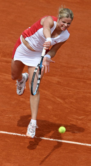 Kim Clijsters of Belgium serves to Slovakia's Daniela Hantuchova during the French Open tennis tournament at Roland Garros in Paris, June 4, 2006.[Reuters]