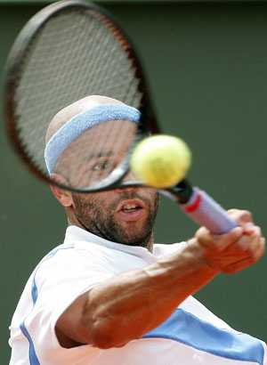 Tennis stars play French Open (Reuters) Updated: 2006-06-05 14:02  James Blake of the U.S. plays a shot to France's Gael Monfils