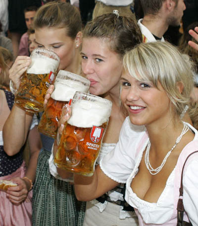 with one-litre beer mugs during the opening day of the Oktoberfest in Munich in