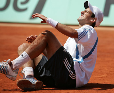 Novak Djokovic of Serbia falls during his quarterfinal match against Spain's Rafael Nadal in the French Open tennis tournament at Roland Garros in Paris, June 7, 2006. [Reuters]