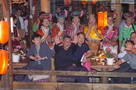 Ho Hau Wah, Chief Executive of Macao Special Administrative Region (SAR), sings excitedly in a Naxi-style bar in ancieht city Lijiang, southwest China's Yunnan Province Wednesday, June 7, 2006. He sang for two hours. [newsphoto]