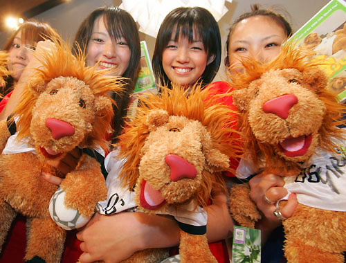 Japanese models show off official mascots of 2006 FIFA World Cup, named 'Goleo VI', during an event in Tokyo June 9, 2006, ahead of the opening match of the World Cup. [Reuters]