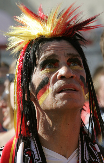 A German soccer fan watches the World Cup 2006 opening match between Germany and Costa Rica on a huge video screen in Hamburg June 9, 2006. [Reuters]