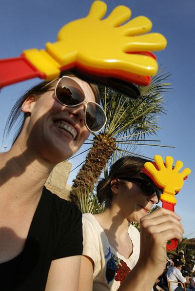 German soccer fans shade their faces with funny hands while watching the World Cup 2006 opening match at a beach bar in Hamburg's harbour June 9, 2006.[Reuters]