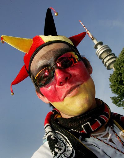 A German supporter smiles in front of Munich's television tower during the opening World Cup soccer match between Germany and Costa Rica broadcast at a huge tv screen at a so-called 'fan festival' in Munich, June 9, 2006. Thousands of supporters see the opening match of the soccer World Cup of Costa Rica against Germany on huge screens in various places in the city. [Reuters]