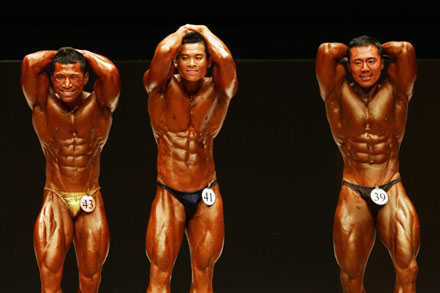 Competitors flex their muscles during the "Men's 70kg or below Championship Final" at the Hong Kong Bodybuilding Championship in Hong Kong June 11, 2006. [Reuters]