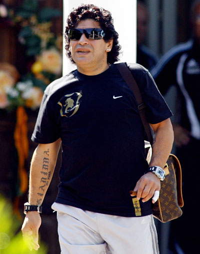 Argentina's former soccer player Diego Maradona waves to fans as he leaves the hotel after visiting the Argentine team in Herzogenaurach June 12, 2006. [Reuters]