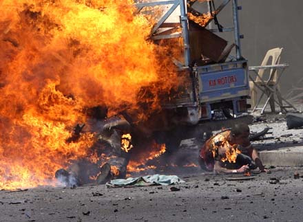 A victim tries to crawl away from a burning vehicle moments after a car bomb attack along a road in Baghdad June 14, 2006. Americans can expect steady progress in Iraq but it would be unrealistic to hope for "zero violence," President George W. Bush said on Wednesday after a surprise trip to Baghdad to bolster the new Iraqi government.[Reuters]