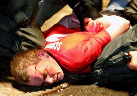 A German policeman detains a Polish soccer fan after the World Cup 2006 soccer match between Poland and Germany in Dortmund, June14, 2006.[Reuters]