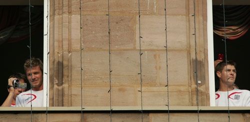 England's David Beckham (L) and Steven Gerrard look out to hundreds of soccer fans from windows of the team hotel in Nuremberg, June 14, 2006. England plays Trinidad and Tobago in their first round World Cup 2006 match on Thursday.[Reuters]
