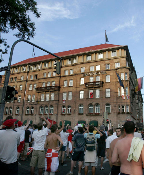 England soccer fans wait outside the team hotel in Nuremberg after some England team members appeared at windows, June 14, 2006. England plays Trinidad and Tobago in their first round World Cup 2006 match on Thursday. [Reuters]