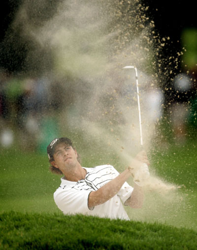 Australian golfer Adam Scott hits out of a sand trap on the fifth hole during